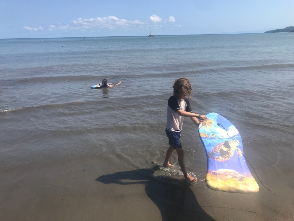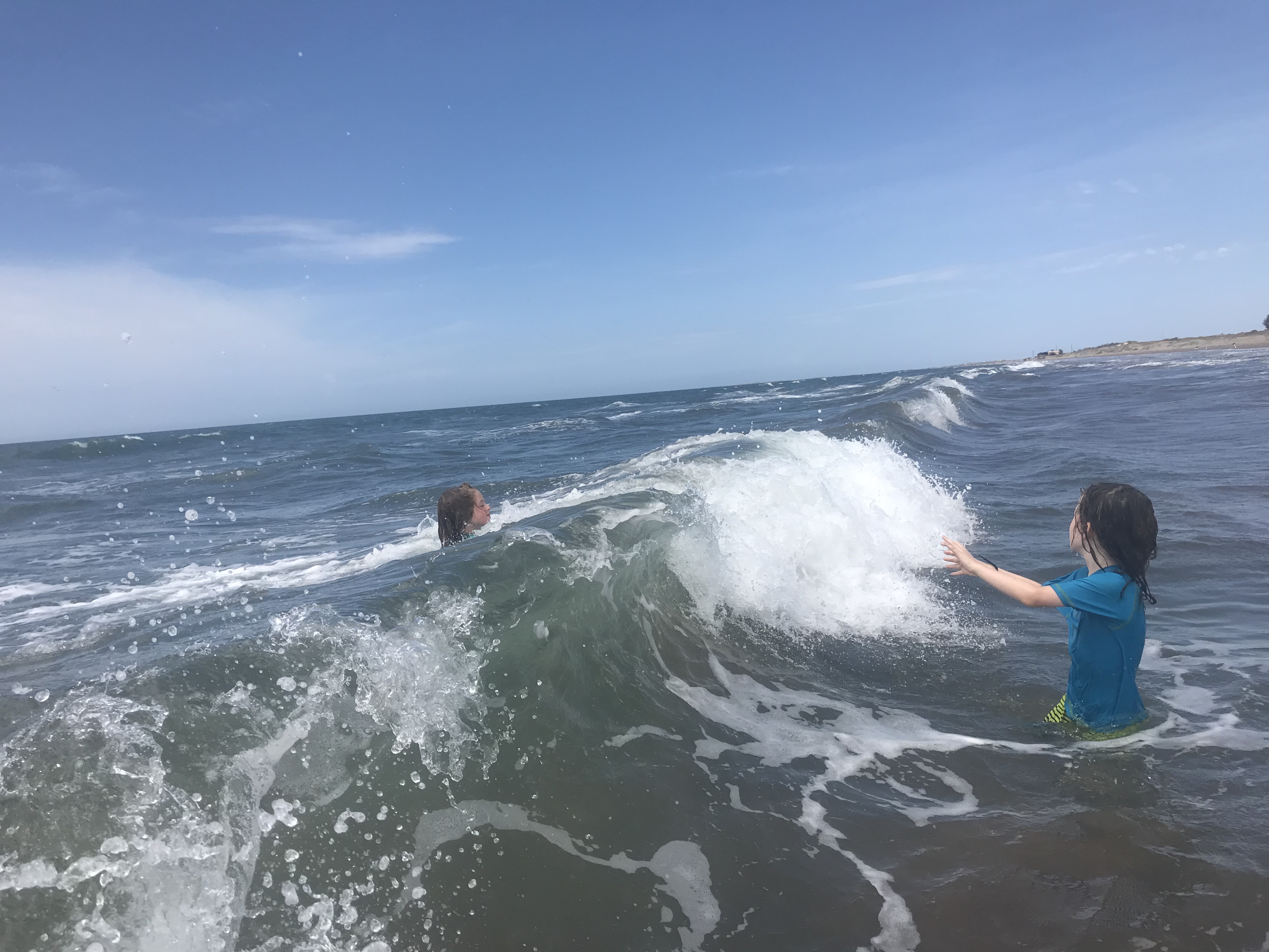 We played in the ocean and I got collapsed by a wave. It was very fun. After I got collapsed by a wave, we went to get a late breakfast. We had guacamole and chips and the guacamole was in an edible bowl. It was kind of smooth with little bits of tomato in it.