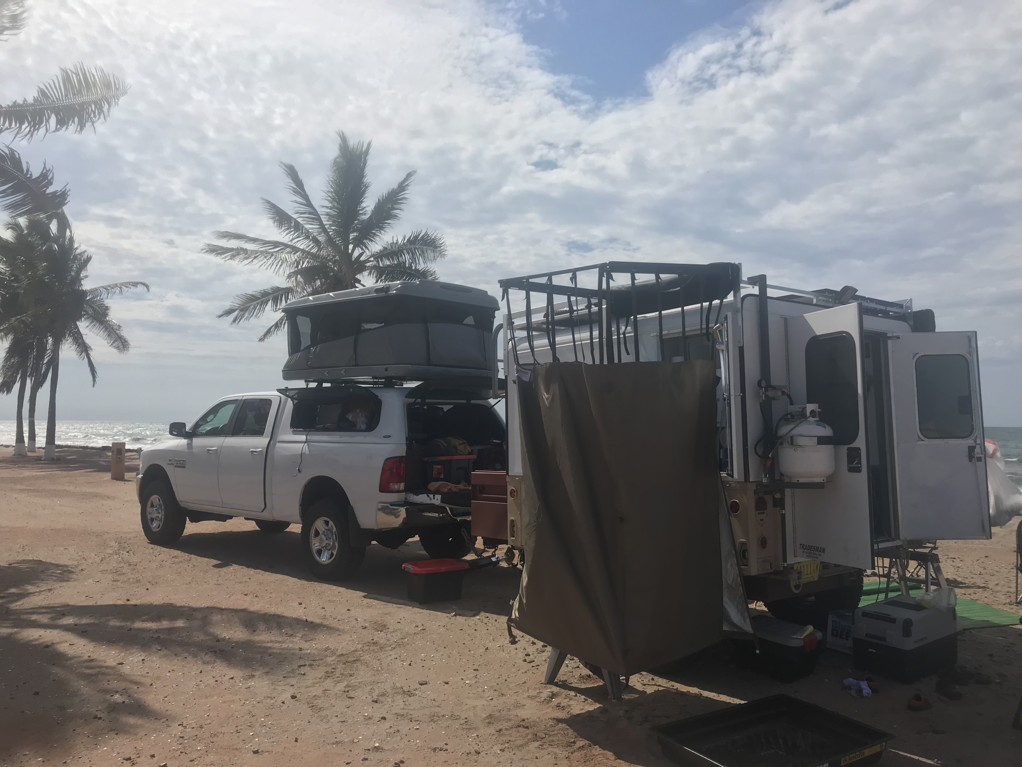 La Luchadora on the beach, with the shower set up. No one else is here.