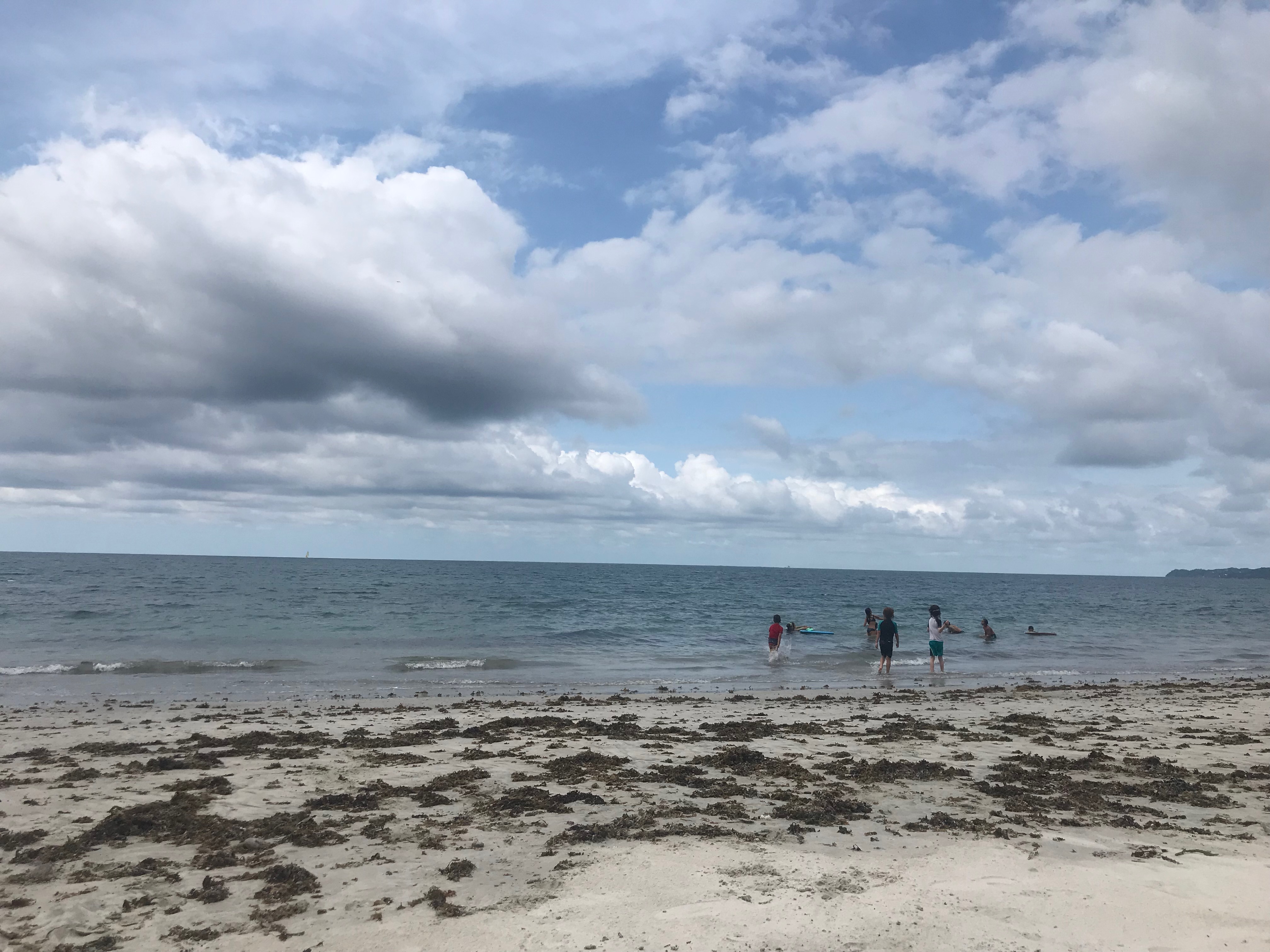 We found a bunch of cool shells. The ocean water was very salty and warm. The waves were so powerful. It’s very hot. The water is right by the camping area. The stones are very hard. The ocean is very blue and the mud is very brown. The sand is super beige. The shells are purple and a bunch of colours.