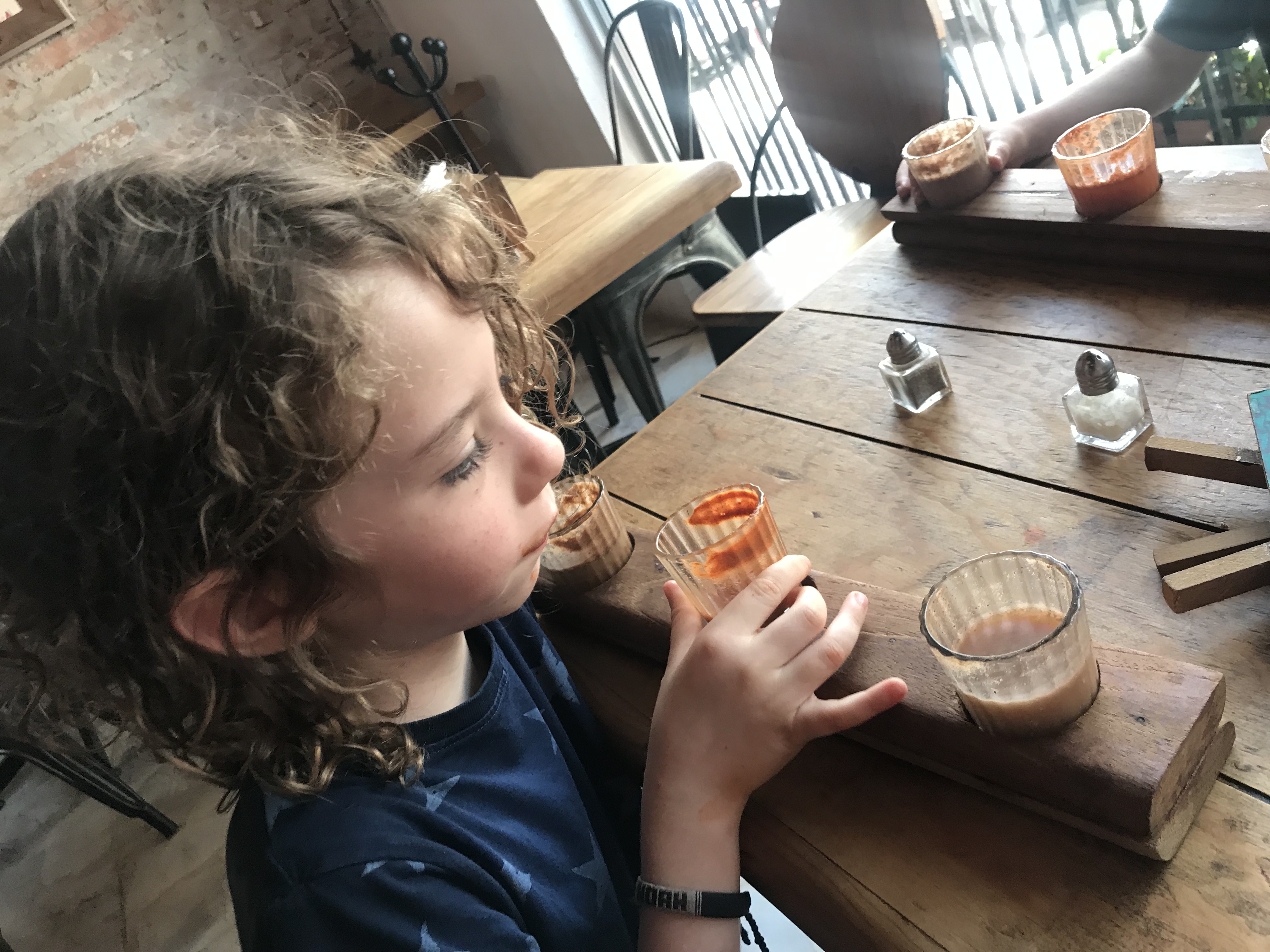We also had a taster of three different Prehispanic drinks. That means drinks that the Native people drank before the Spanish came. They were made from water, sugar, corn and cocoa. They tasted kind of chocolatey. One was really good, one was in the middle, and one tasted like water with sugar. I liked the one called Tascalate (the chocolatey one) best.