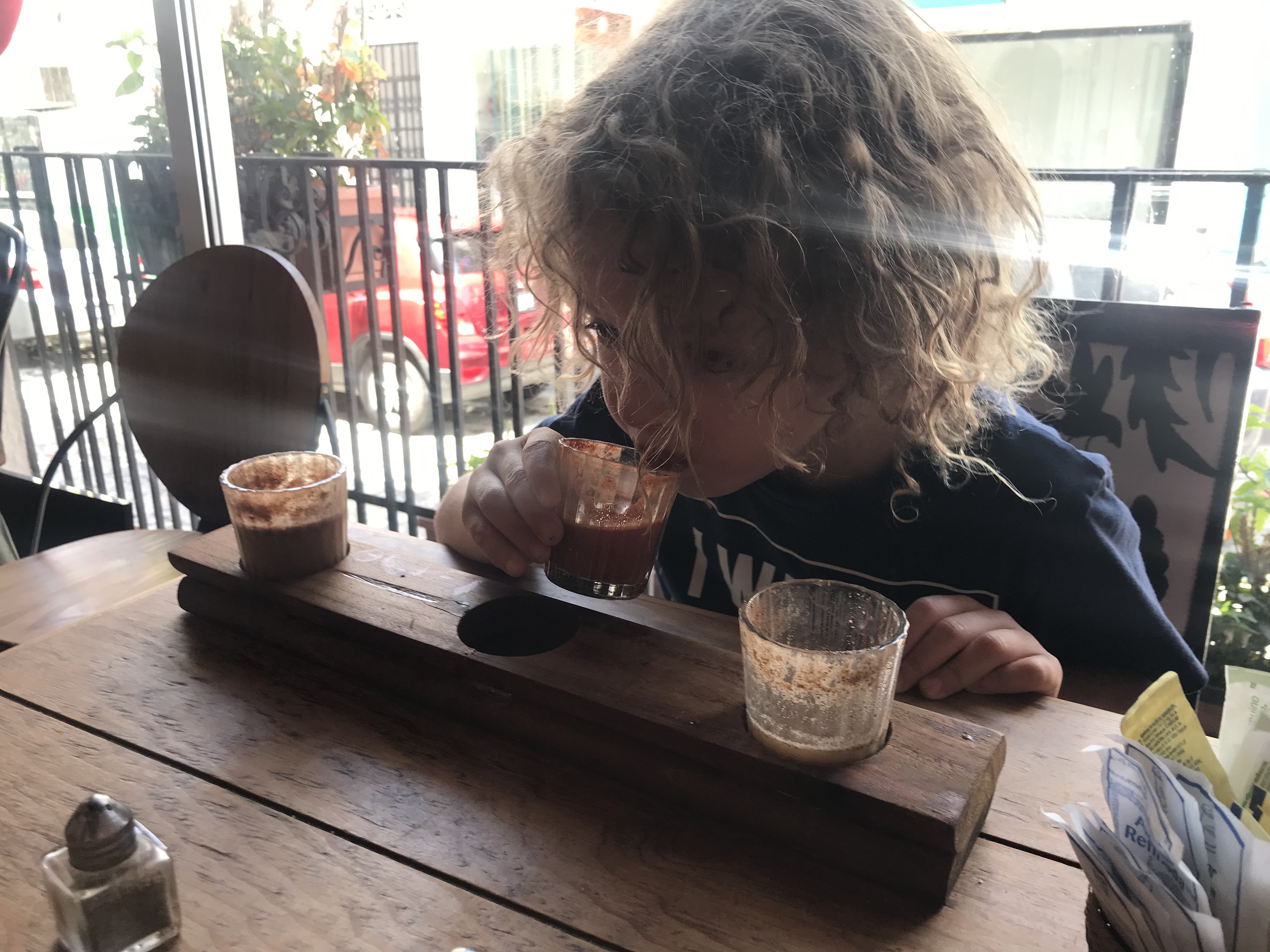 Trying the Prehispanic drinks. The middle one, the Tascalate, was my favorite.